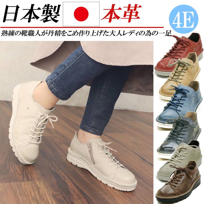 日本製 本革 スニーカー レディース レザースニーカー ローカット 4E 幅広 紐 カジュアルシューズ 軽量 撥水