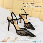 パンプス ハイヒール レディース アンクルストラップ ピンヒール ポインテッドトゥ エレガント シューズ 痛くない サンダル 9cm レース