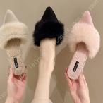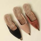 ファー付き ミュール サボサンダル パンプス レディース 幅広 フラットヒール あったか ファースリッパ 秋冬 スリッパ 外履き 事務所 お仕事 バブーシュ