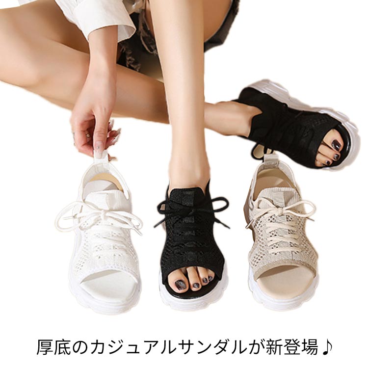 【レビュー特典 20%OFF】スニーカーサンダル 痛くない メッシュ 調節可能 オープントゥ 厚底 サンダル フィットサンダル フラットサンダル レースアップ 韓国ファッション レディース 軽量 スポサン サンダル 行 アウトドア タウンユース スポーツサンダル