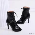 選べるヒール レースアップ ブーツサンダル レディース 夏 秋 ピンヒール 革 ショートブーツ 編み上げ ハイヒール 大きいサイズ オープントゥ サマーブーツ
