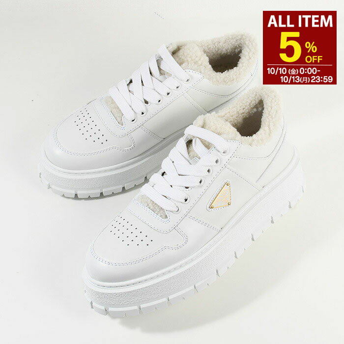 【5%OFFクーポン】PRADA プラダ 靴 シューズ スニーカー レザーxシアリング 1E947M 3LEN レディース BIANCO ホワイト レザー トライアングルロゴ コットンレースアップ スポーティ 冬