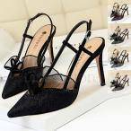 フェイクレザー リボン付き バックストラップ ピンヒール パンプス 女性 レディース シューズ ミュール サンダル ポインテッドトゥ 上品