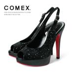 COMEX パンプス ハイヒール オープントゥ ラメベルベット サンダル ヒール 14cm ピンヒール バックストラップ ブラック ラメ comex5412v 日本製 レディース
