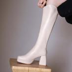 ブーツ レディース ロング ソリッド カラー フロック シャーリング ヴィンテージ スクエア ニーヒール ブーツ くしゅくしゅ ロングブーツ レディース 美脚