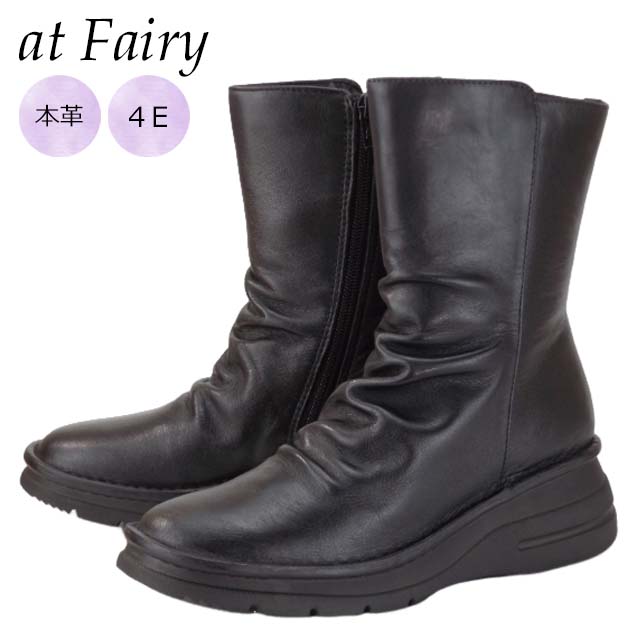 【楽天スーパーSALE限定特価】ミドルブーツ レディース at Fairy 9958 本革 レザー 黒 ブラック 幅広 4E EEEE シャーリング サイドファスナー カジュアル 履きやすい ミセス 30代 40代 50代