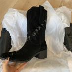 レディース ウエスタンブーツ スエード リベット パンチング 刺繍 ロングブーツ ミドルヒール ポインテッドトゥ スクエアヒール 可愛い