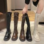 ロングブーツ レディース ニーハイ 大きいサイズ かわいい 編み上げブーツ レースアップ ローヒール サイドジップ 歩きやすい 秋冬 シューズ 長靴