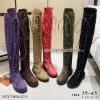ニーハイブーツ 編み上げ レディース スエード調 フェイクレザー 大きいサイズ ローヒール ロング 丸紐 レースアップブーツ 春秋 靴 ブ