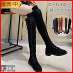 ニーハイブーツ 編み上げ レディース スエード調 フェイクレザー 大きいサイズ ローヒール ロング 丸紐 レースアップブーツ 春秋 靴 ブ