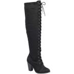 【並行輸入品】Forever レディース チャンキーヒール レースアップ ニーハイ ライディングブーツ ブラックスエード 9