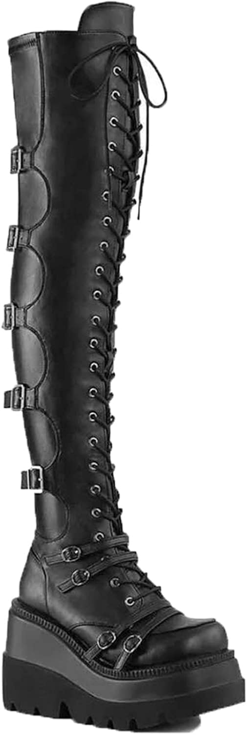 【20%OFFクーポン〜】ロングブーツ 編み上げ 厚底12cm ウェッジ ニーハイブーツ レディース 原宿風 個性的 カッコイイ ベルト飾り バイク ゴシック パンク 暗黒系 レースアップ 身長アップ 大きいサイズ