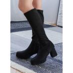 ブーツ スクエアトゥプレートヒールストレッチロングブーツ レディース