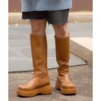 ブーツ レザー調厚底フラットロングブーツ レディース