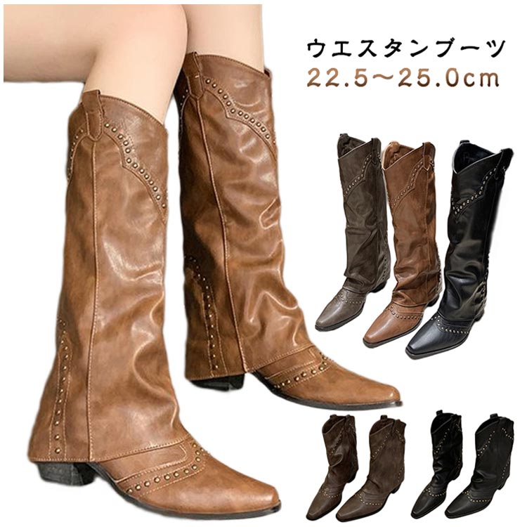 ブーツ スタッズ付き レッグカバー風 ロング ウエスタン ブーツ レディース