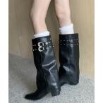 ブーツ ダブルベルト スタッズデザイン ポインテッドトゥロングブーツ レディース