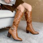 ロング ブーツ レディース ジョッキーブーツ スクエアトゥ チャンキーヒール ブーツ フェイクレザーブーツ ゆったり おすすめ 疲れない おしゃれ 秋冬靴 ミドルヒール 長靴