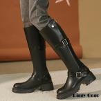 ロングブーツ レディース レザー調 秋冬 エンジニアブーツ ローヒール ジッパー ジョッキーブーツ 長靴 膝丈 太ヒール 5cm 履き口 サイドジップ ワークブーツ