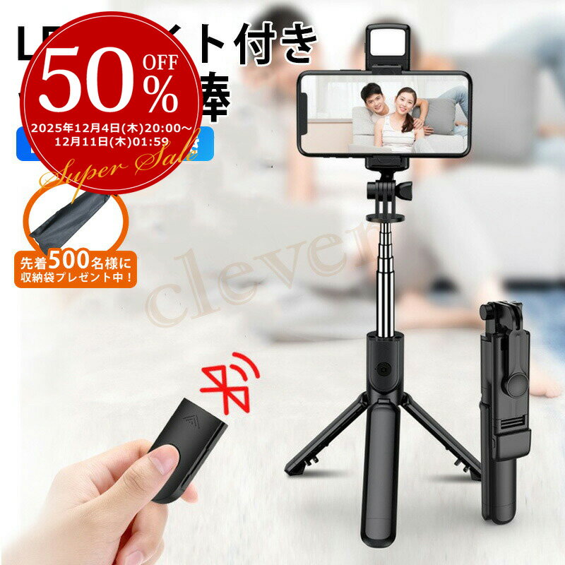 【半額55%OFF★SS大特価】自撮り棒 三脚 自撮り棒 iPhone アンドロイド じどり棒 軽量 スマホ自撮り棒 長い セルカ棒 自撮りスタンド コンパクト 手持ち ライト付き 手ブレ補正 スマホ用三脚 セルフィースタンド 動画撮影 iPhone 15/15 Pro 14 13 12 便利グッズ