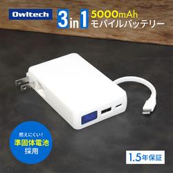 準固体電池採用5000mAhACモバイルバッテリーホワイト OWL-LPBAC5003-WH