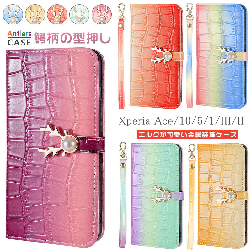 Xperia Ace 10 5 1 III II ケース 手帳型 鰐柄の型押し エクスペリア Ace II SO-41B ケース おしゃれ かわいい SIMフリー スマートフォン Xperia5 III 保護カバー 好きな 鹿 グラデーション 美しい 光沢 手帳スマホケース 耐衝撃 金属装飾 スマホストラップ ハンドストラップ