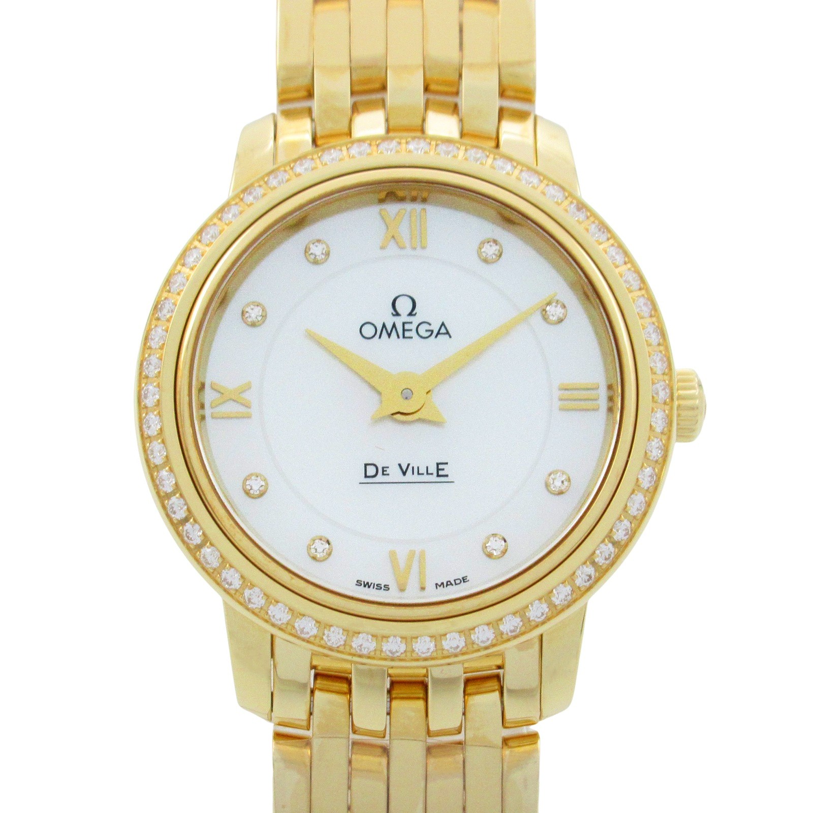 ≪5%OFF&まとめ買い対象≫オメガ OMEGA デ・ビル プレステージ ダイヤベゼル 腕時計 時計 K18(イエローゴールド) ダイヤモンド レディース ホワイト系 ホワイトシェル 424.55.24.60.55.001 【新品】