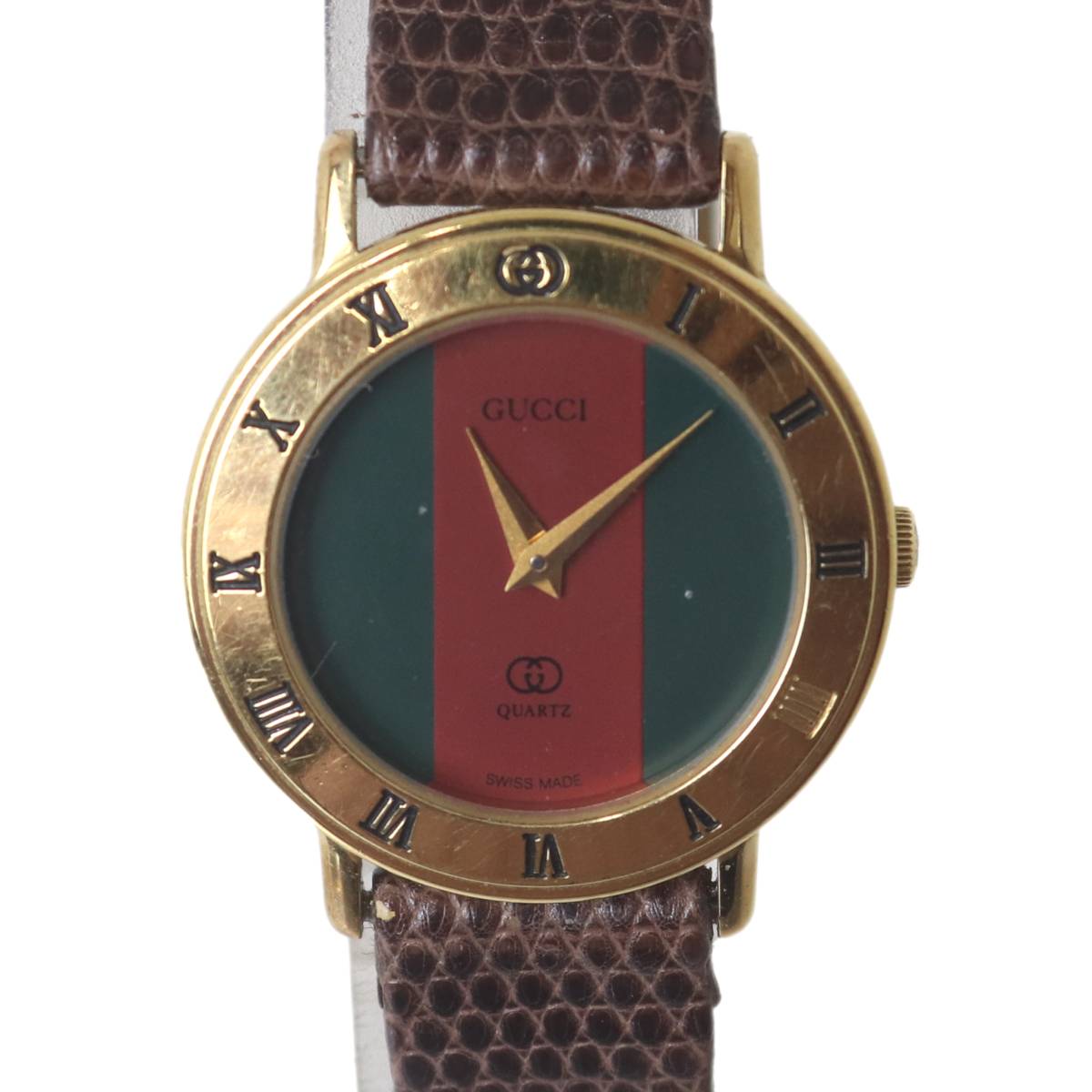 【中古】 GUCCI グッチ レディースクオーツ 腕時計 シェリーライン ゴールド×ブラウン×文字盤グリーン×レッド 3001L 腕回り約14~18(cm) ケース:25×29.8(mm) NT Bランク