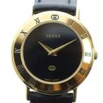 グッチ GUCCI 3000L 腕時計 ウォッチ クォーツ ローマン ラウンド レザーベルト 黒文字盤 ゴールド色 ■GY18 /MQ ■OH レディース