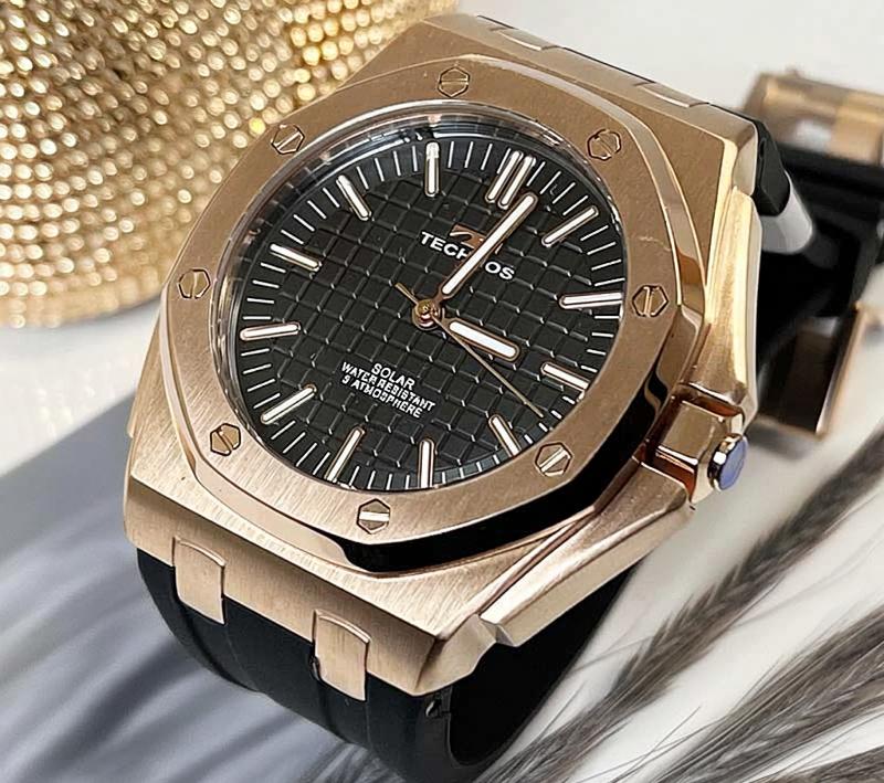 【電池交換不要のソーラーです】テクノス 腕時計 メンズウォッチ TECHNOS technos 腕時計 ラッピング無料 手書きのメッセージカード T9C35PB ピンクゴールドカラー文字盤 ラバーベルトでラグジュアリー感が半端ない