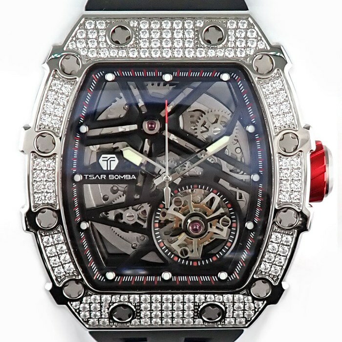 【レビュー1000件記念★対象品3%OFF&15日限定P3倍】 サーボンバ TSAR BOMBA 腕時計 エレメンタル シリーズ キュービックジルコニア オートマチック B0BG54HDDG 裏スケ 夜光インデックス 夜光針 トノー スケルトン文字盤 SS ブラックラバーベルト 自動巻き