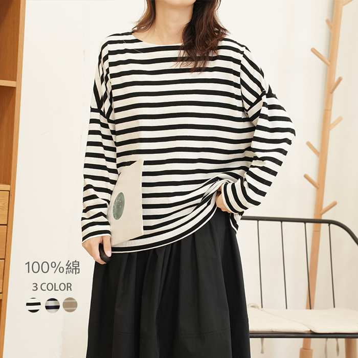 トップス ゆったり ロンT 長袖 大きめ ゆったりサイズ 大きめサイズ 大きいサイズ ボーダー レディース 女性 体型カバー 使いやすい 着回し デイリー カジュアル 20代 30代 40代 50代 60代 肌触り 着心地 良い 素材 だぼっと 着れる F フリーサイズ プチプラ 韓国風 春 秋 冬