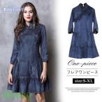 デニムワンピース レディース ワンピース デニム 七分袖 チャイナドレス 刺繍 ボリューム フレア aライン アオザイ 膝丈ワンピース リゾート