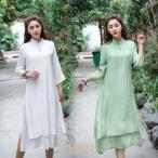 ワンピース 七部袖 Aライン ロングワンピース コットン アオザイ風 スタンドカラー チャイナカラー 重ね着風 白 緑 無地 レディース おしゃれ