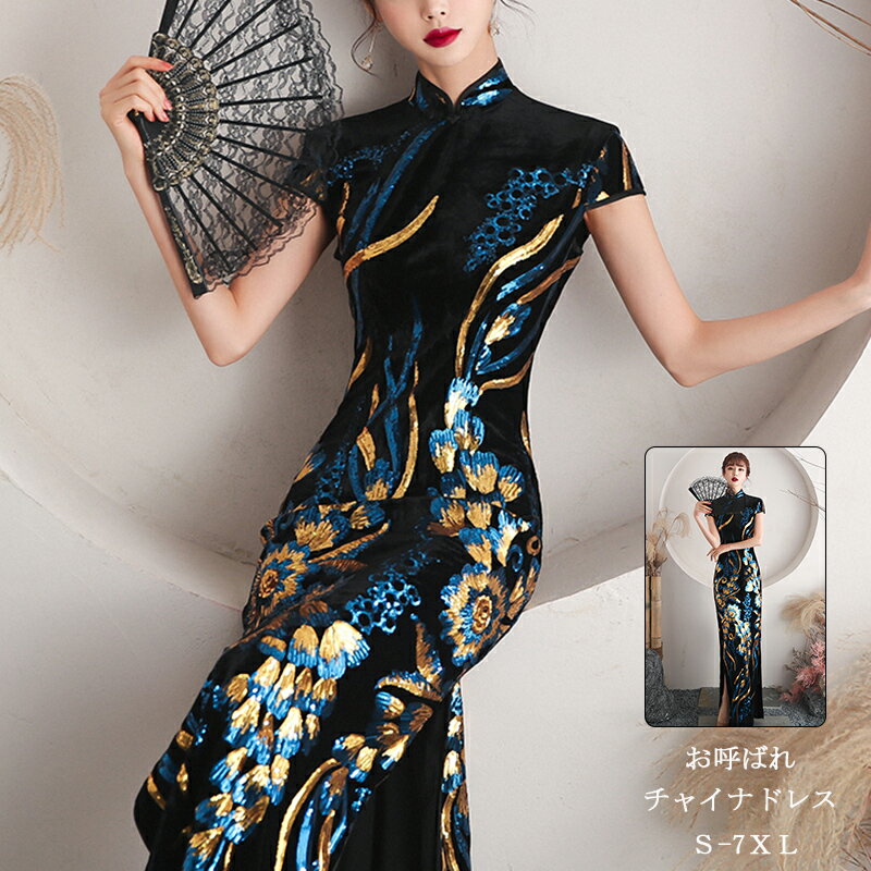 ドレス チャイナ ワンピース チャイナ風 チャイナ服 チャイナドレス ロング アオザイ 大人 レディース ロングドレス ロングワンピース 長袖 七分袖 ベルベット パーティードレス 結婚式 二次会 花嫁 演奏会 合唱 舞台 演出服 司会者 披露宴 忘年会 総柄 エスニック M-5XL