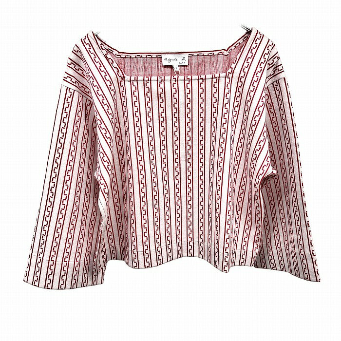 【楽天スーパーSALE限定!! \★35%OFF★/対象商品|12月4日(木)20時00分〜12月11日(木)01時59分まで】【新品】agnes b. ショート丈 Tシャツ カットソー ワイドスリーブ チェーンストライプ 7分袖 スクエアネック 綿など 2 レッド レディース