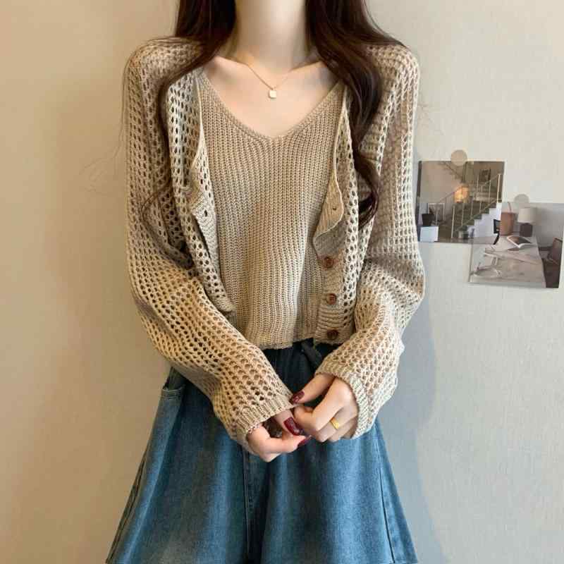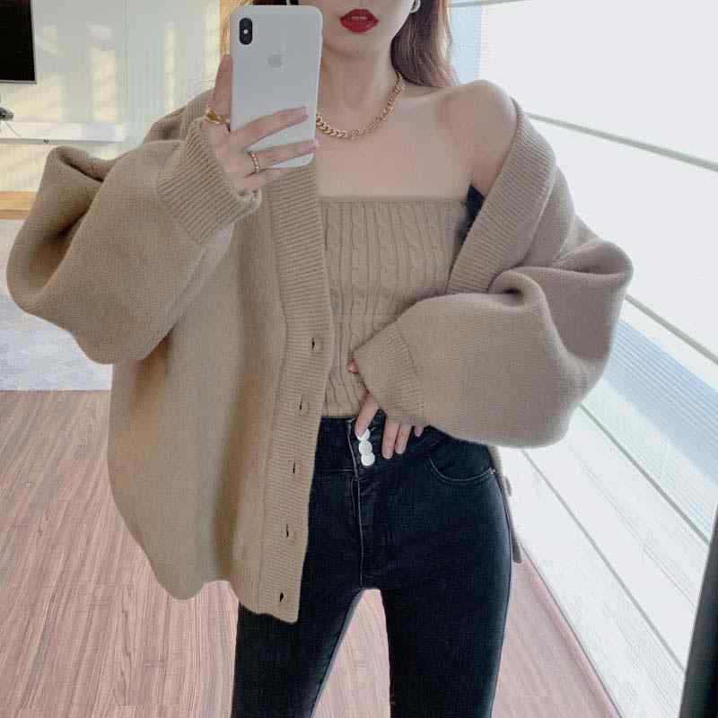 ニットアンサンブル レディース カーディガン トップス キャミソール カシュクール 長袖 ショート丈 接触冷感 無地 薄手 ゆったり かわいい きれいめ おしゃれ 韓国風 カキ色