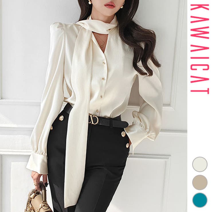 【10%OFFクーポン!12/11(木)1:59まで】KawaiCat ブラウス レディース トップス シャツ 長袖 Vネック リボン タイ ボウタイ カットソー 上品 きれいめ おしゃれ オフィス お仕事 白 お呼ばれ 結婚式 二次会 春 秋 冬 韓国