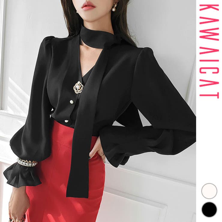 【10%OFFクーポン!12/11(木)1:59まで】KawaiCat ブラウス レディース トップス シャツ 長袖 ボウタイ タイ カットソー 配色 バイカラー 品 きれいめ おしゃれ オフィス お仕事 お呼ばれ 結婚式 二次会 春 秋 韓国服 韓国