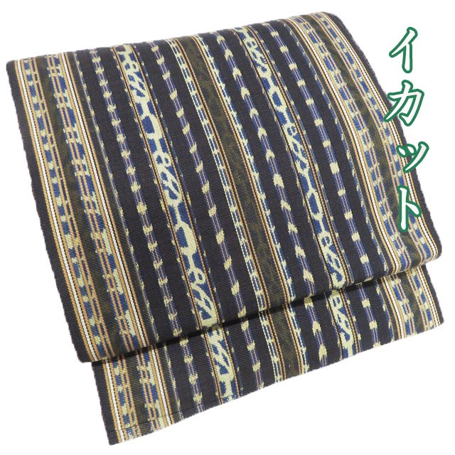 楽天スーパーSALE 【新古品】 名古屋帯 未使用 九寸 貴久樹 京都 木綿 綿 全通 手織り 草木染 イカット インドネシア 黒 黄ベージュ 黄茶色 縞 花 カジュアル 名古屋帯 春 秋 冬 仕立て上がり みやがわ sb53618