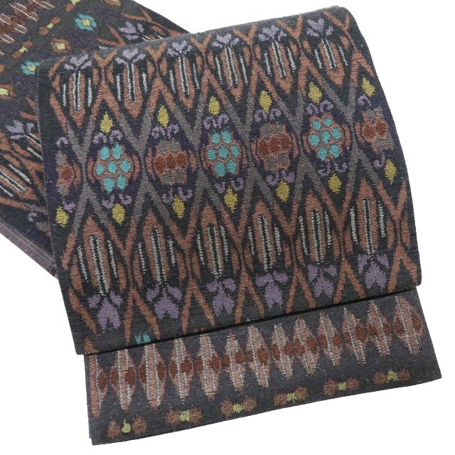 【 中古 】 特選 袋帯 リサイクル 正絹 紬地 カジュアル 仕立て上がり 六通 イカット模様 マルチカラー 墨色 茶色 多色 A1101-11 [和服 紬 着物 帯 しゃれ帯 kimono 送料無料 きもの北條]