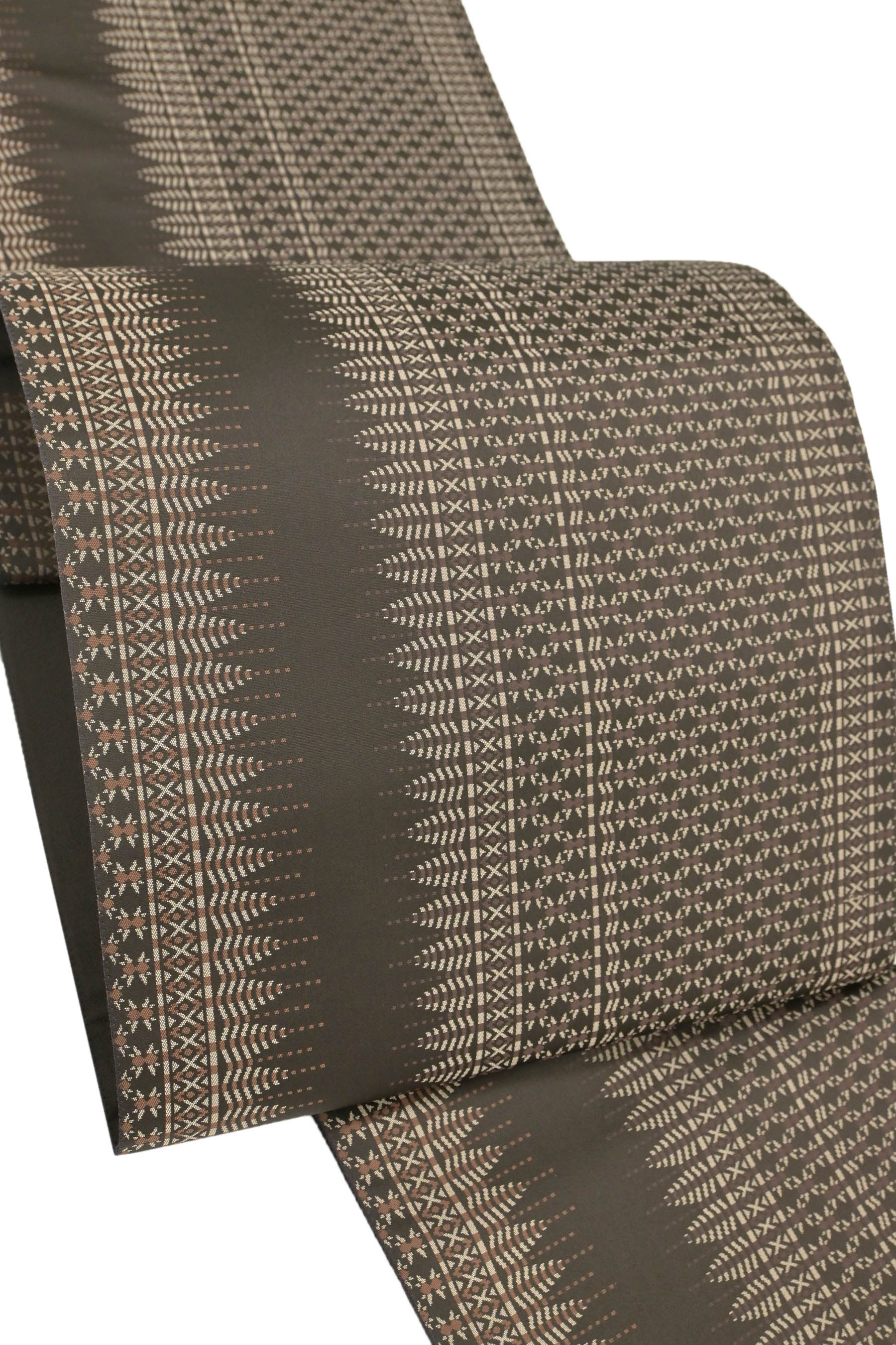 【お得なエブリデイロープライス】創作洒落袋帯 ≪御仕立て上がり・中古品≫ 「イカット装飾細間道」 シックなカジュアルの帯姿に 今欲しい、すぐ締めたい!