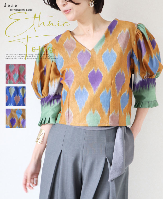 トップス 五分袖 ふんわり袖 イカット柄 ミディアム丈 レディース ファッション 大人カジュアル エスニック アジアン綺麗め「上品にエスニックを楽しむ フリルとふんわり袖のトップス」
