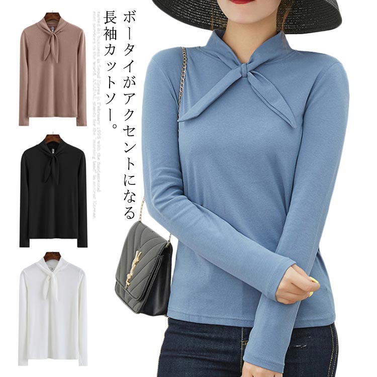 カットソー 長袖 ボウタイ tシャツ 送料無料 レディース 無地 トップス リボン ハイネック インナー カジュアル 大きめ OL 通勤 春秋 フェミニン 大きいサイズ