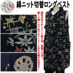 綿ニット切替ベスト 和柄前開きベスト はんなり ロングベスト 90cm丈 綿100% 和柄 前開き ベスト 袖なし 両サイドポケット インド綿 紺 チュニック ネイビー