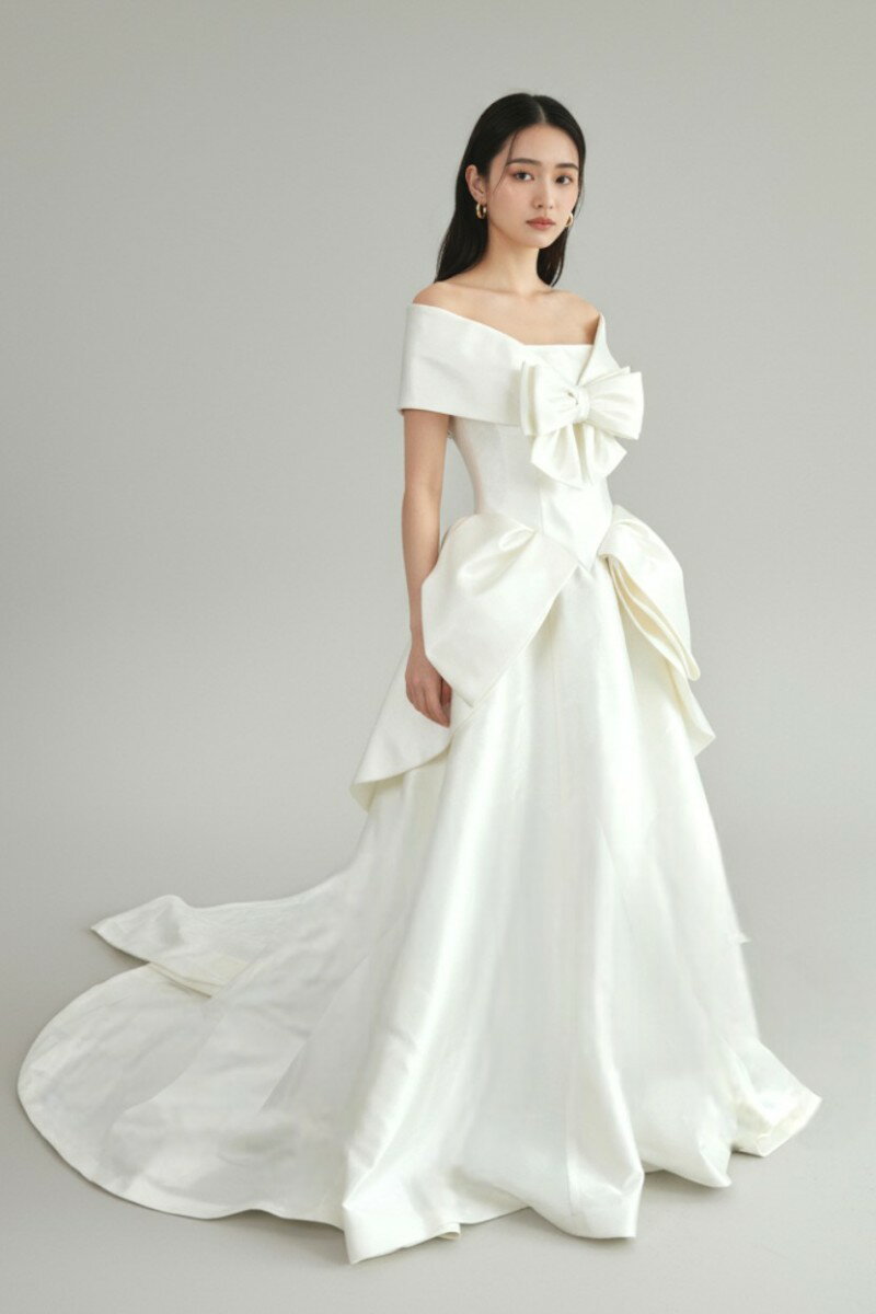 エマリーエ EMarie ダブルリボンケープカラー Aライン ウェディングドレス ホワイト 白 サテン