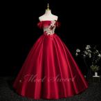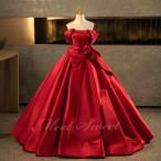 カラードレス ワインレッド サテン オフショルダー 演奏会 発表会 二次会 花嫁 ウエディングドレス ウェディングドレス ロングドレス Aライン プリンセスドレス