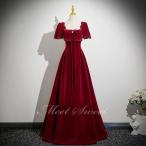 カラードレス ベルベット ワインレッド 半袖 演奏会 発表会 二次会 花嫁 ウエディングドレス ウェディングドレス 成人式 卒業式 ピアノ ロングドレス Aライン