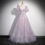 カラードレス パープル パフスリーブ 演奏会 発表会 二次会 花嫁 ウエディングドレス ウェディングドレス 可愛い ロングドレス Aラインドレス プリンセスドレス