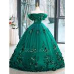 カラードレス グリーン オフショルダー フラワー 演奏会 発表会 二次会 花嫁 ウエディングドレス ウェディングドレス ロングドレス Aライン プリンセスドレス