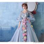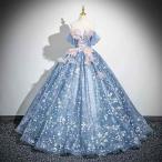 カラードレス ブルー オフショルダー 花柄 姫系 演奏会 発表会 二次会 花嫁 ウエディングドレス ウェディングドレス ロングドレス Aライン プリンセスドレス